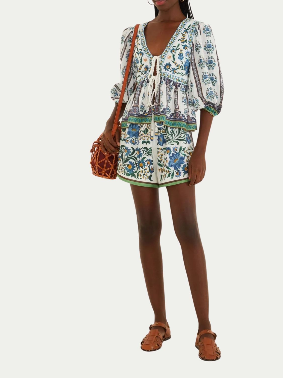 Fiel ao DNA da FARM, a Bata Manoela vem em estampas exclusivas e vibrantes, que celebram a natureza, a brasilidade e o espírito livre da mulher FARM. Pode apresentar florais tropicais, folhagens, frutas ou grafismos artesanais, todos em composição harmoniosa e alegre.