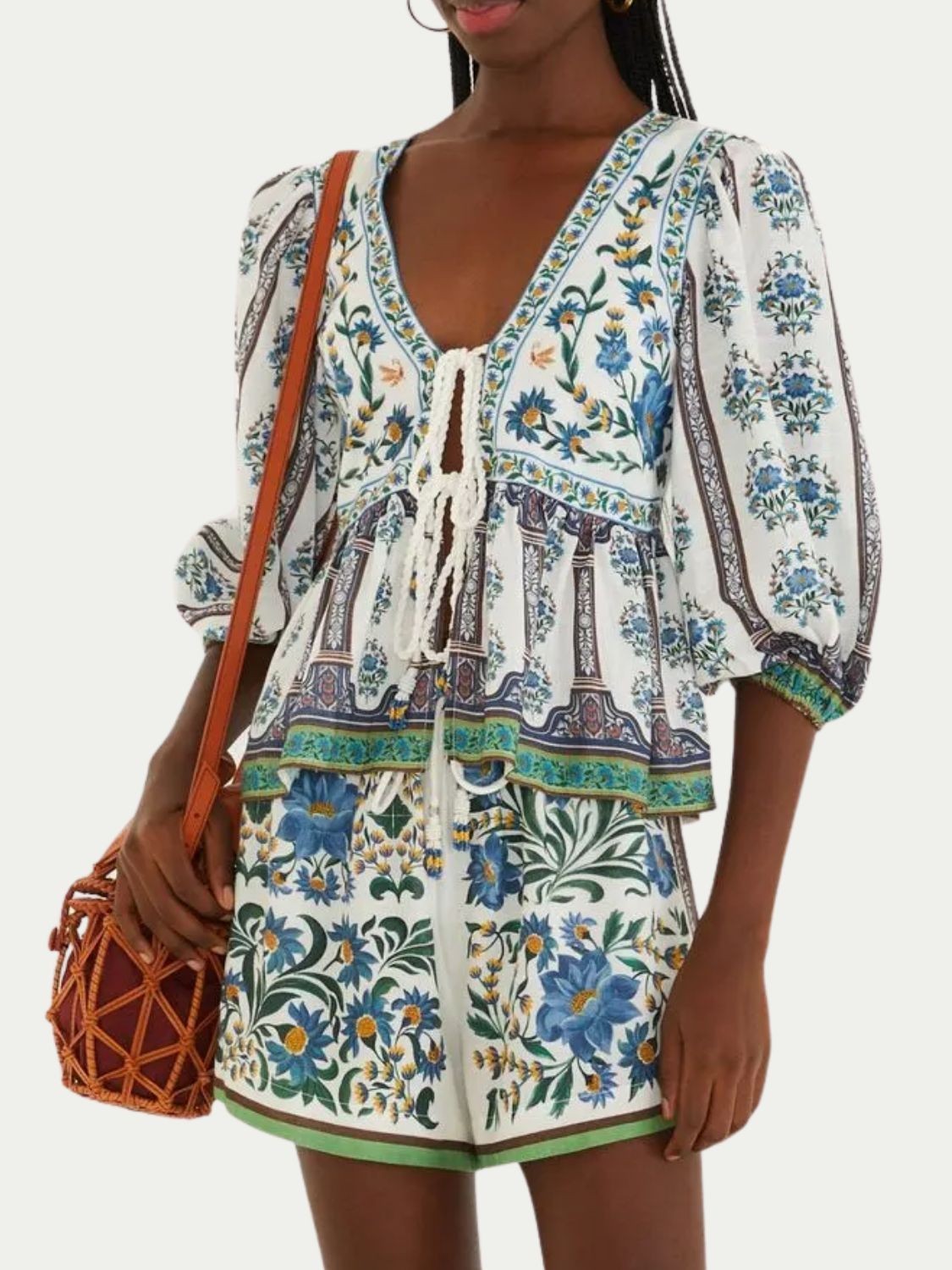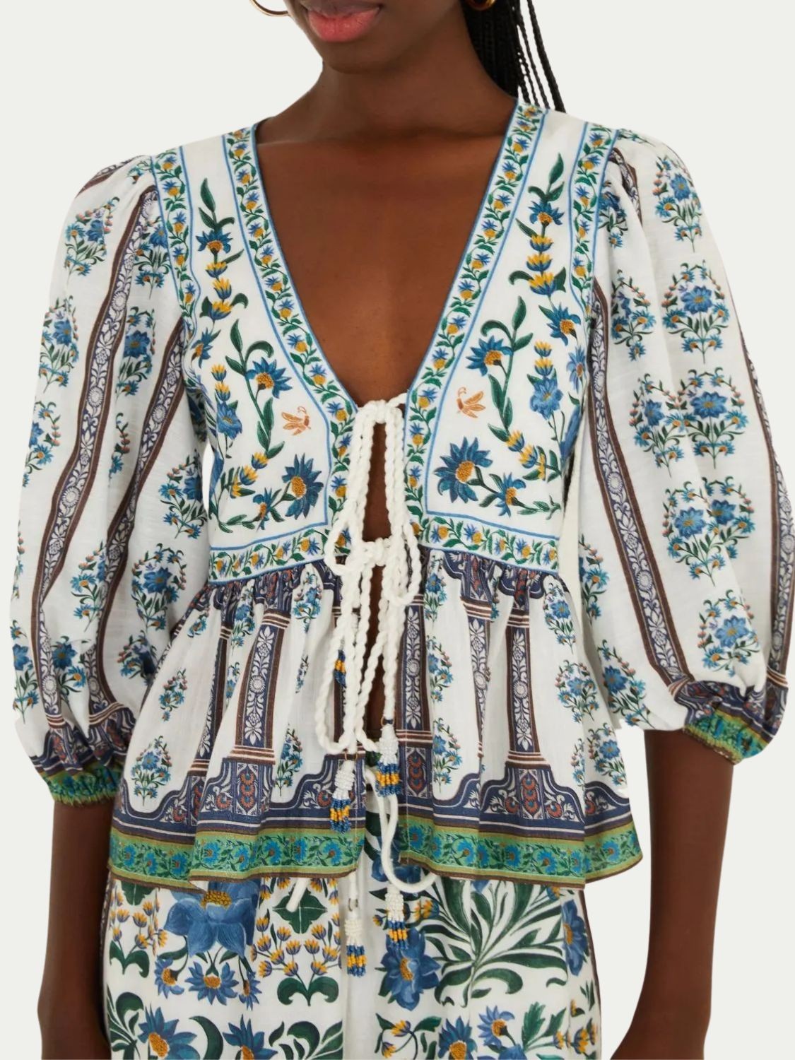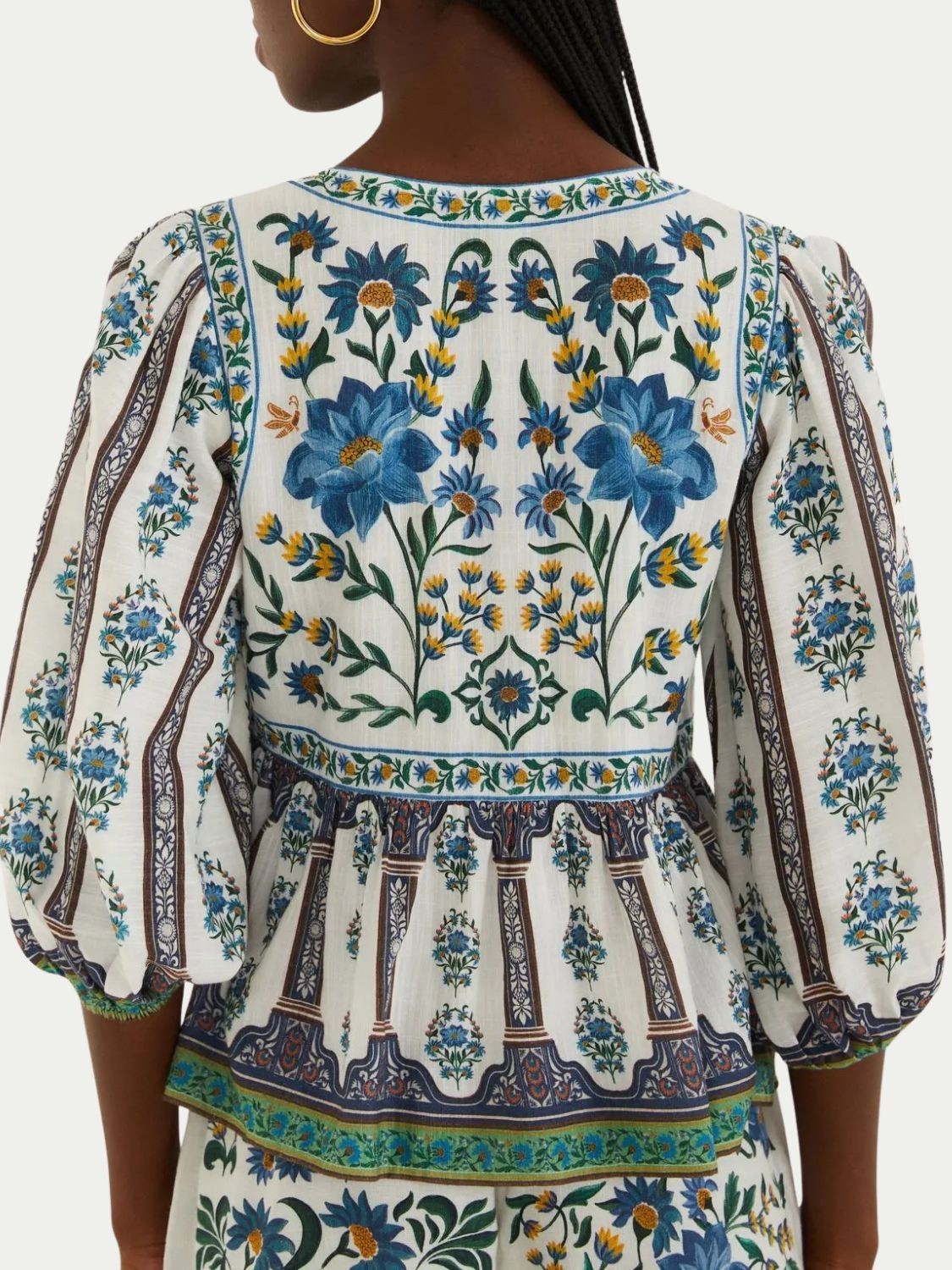 As mangas são um destaque à parte: amplas, em estilo 3/4, com punhos levemente franzidos que criam um efeito bufante suave. Esse detalhe adiciona romantismo e movimento à peça, reforçando a identidade boho-chic da FARM.