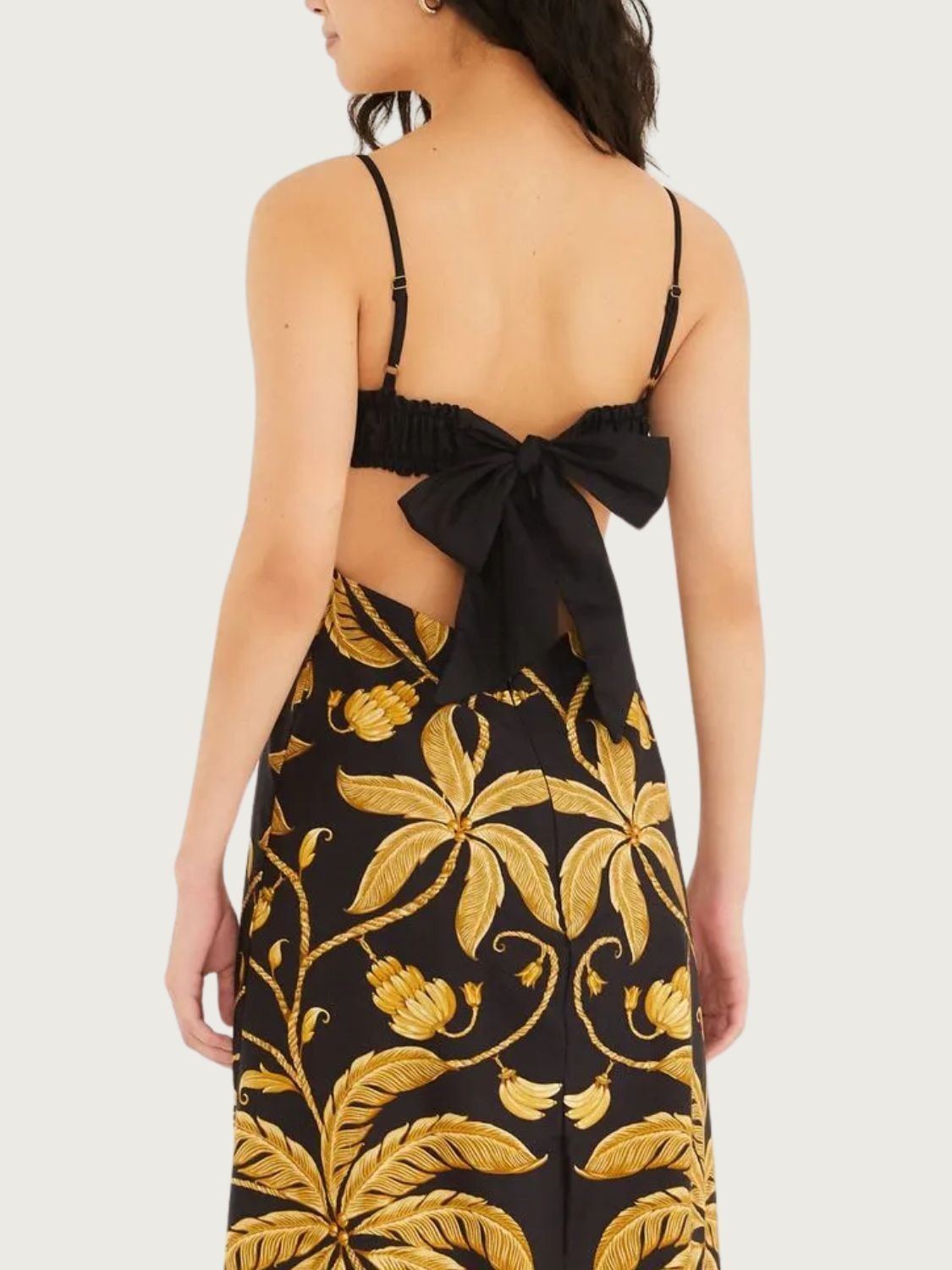Vestido longo Farm em algodão 100% com estampa floral preto. Modelo com costas abertas e alças reguláveis para ajuste perfeito. O fechamento com laçada nas costas oferece charme e praticidade. Ideal para passeios, viagens e dias quentes com muito estilo e conforto.