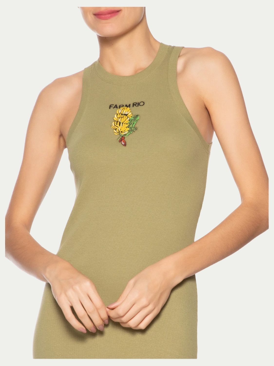 O Vestido Midi Rib Cacho de Banana da FARM é uma escolha perfeita para quem busca um visual que transita com facilidade entre o casual e o sofisticado. Com modelagem midi que valoriza a silhueta sem exageros, ele traz a estampa “Cacho de Banana” — divertida, tropical e com aquele DNA descontraído da marca.